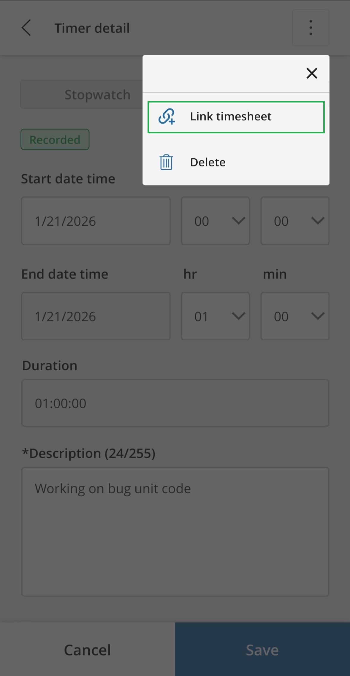 After creating and saving a timer record, you can easily associate it with your timesheet using the “Link Timesheet” menu option.
