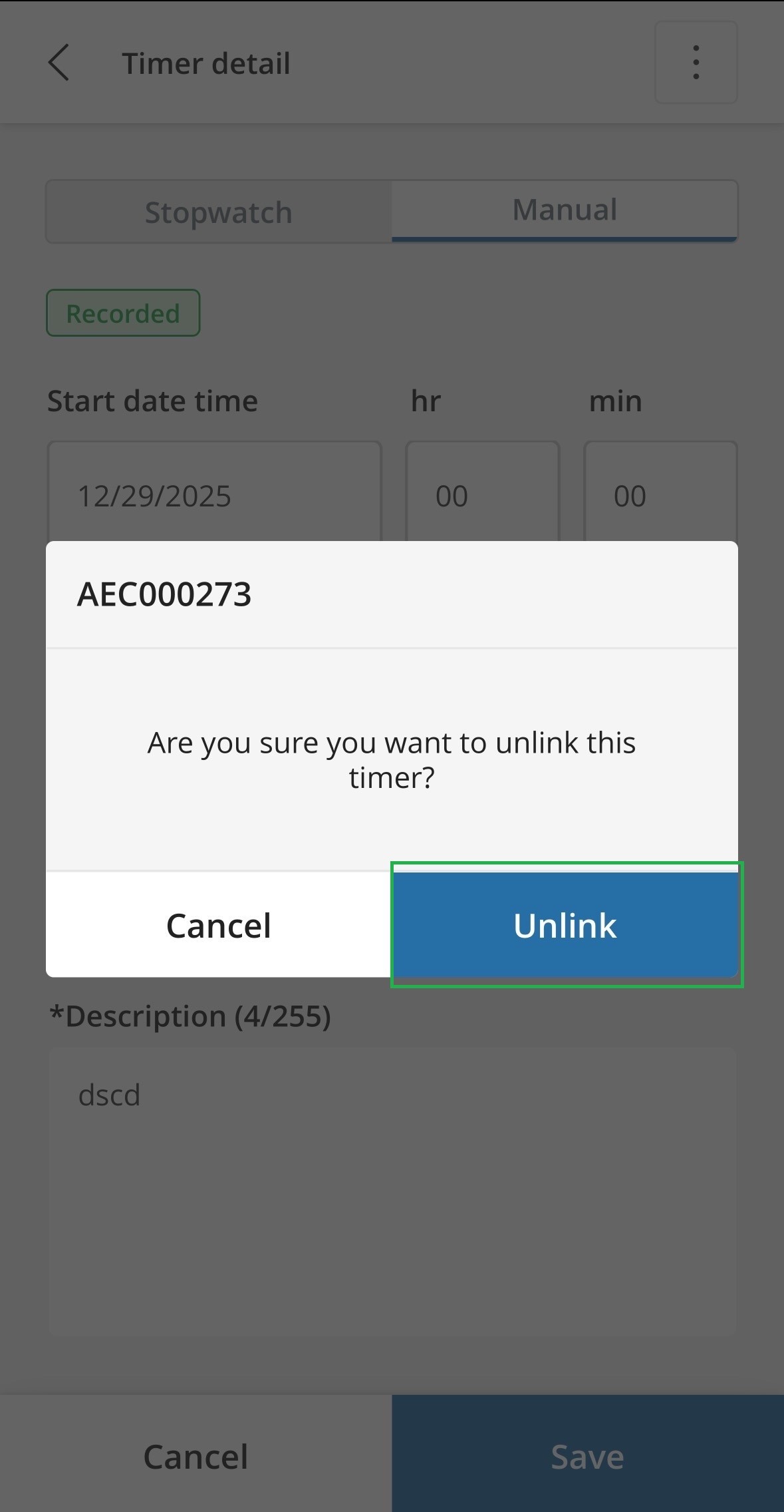 Selecting the “Unlink timesheet” option will display a confirmation pop-up dialog box. This box asks will verify if users want to proceed with unlinking the timer.