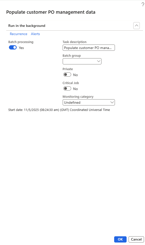 This batch job is designed to automatically update the customer PO data within the Customer PO Management form, ensuring that the information remains accurate and synchronized with the latest system records.