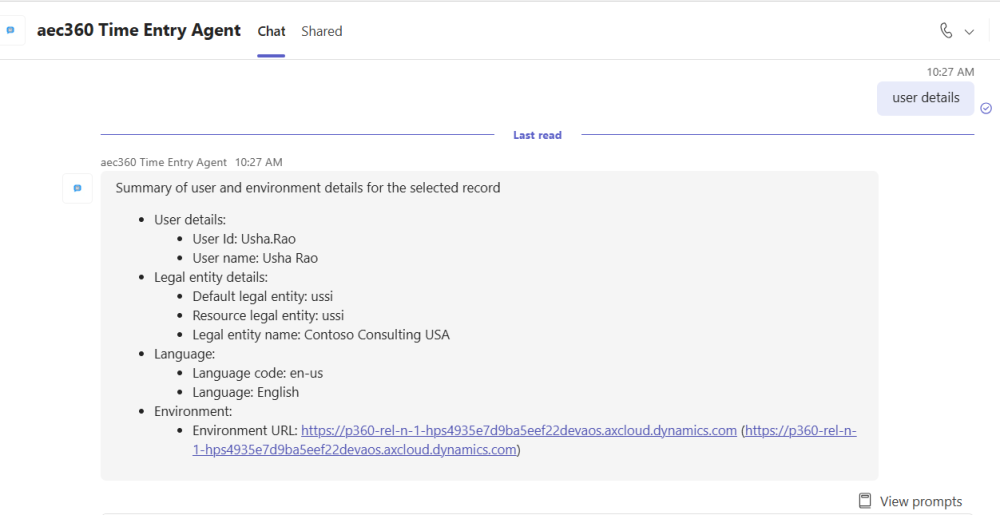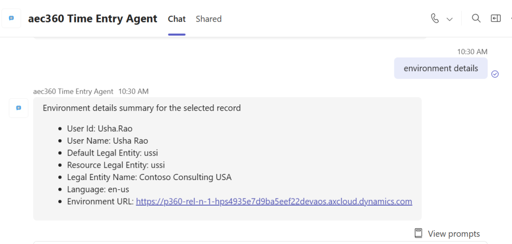 Users can ask the Time Entry Agent to show the environment details, and the agent will provide all relevant information clearly and instantly.