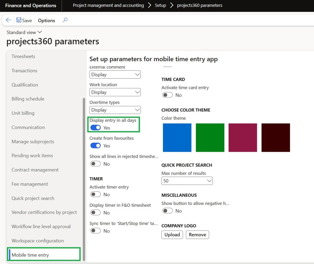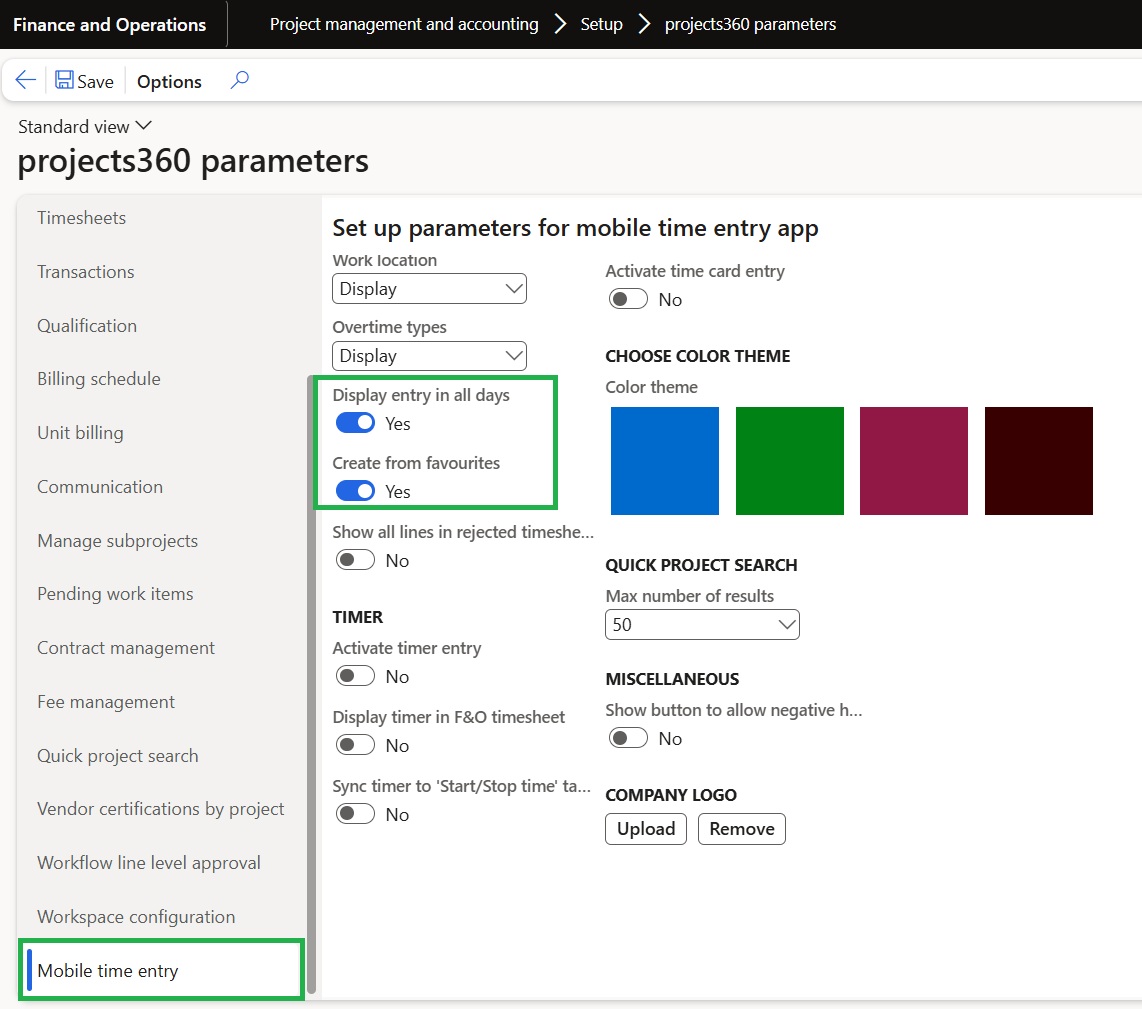 Similar to the ability to create a new timesheet using favorites in Finance and Operations (FO), this feature has now been extended to the Time Entry Power App. A new parameter, “Create from favorites,” has been added to the Projects360 Parameters form.