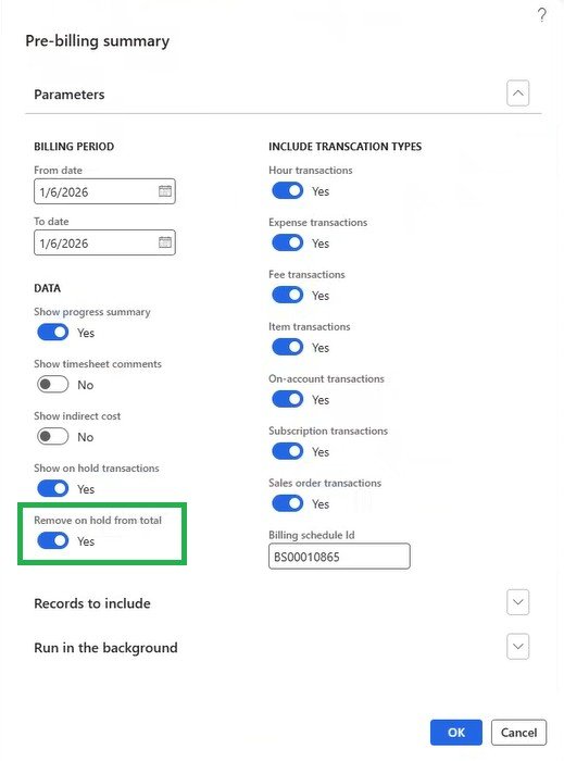On hold from total billing amount in ‘Prebilling summary’ report
