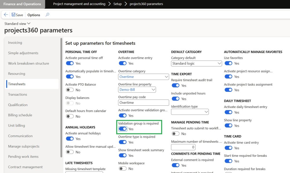 An enhancement has been introduced to improve control over overtime type selection in timesheets, managed through a new Projects360 parameter called “Validation Group is Required.