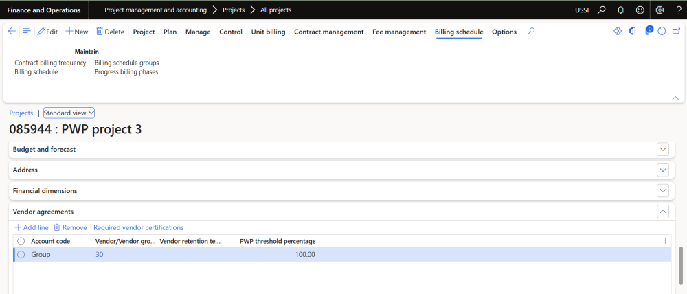 The Pay When Paid process has been enhanced to automatically create a Vendor Agreement when a new project is created. This occurs only if the Default Vendor Group parameter is populated. The logic applies to projects created manually in Finance and Operations, as well as those created automatically through Dual-write when the ProOps integration is enabled.