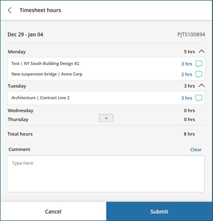 As part of this update, we’ve introduced enhancements that allow users to review both internal and external comment summaries before submitting a timesheet. During submission, a dropdown next to the daily hours displays the comment summary for each timesheet line, making it easier to review and confirm details.